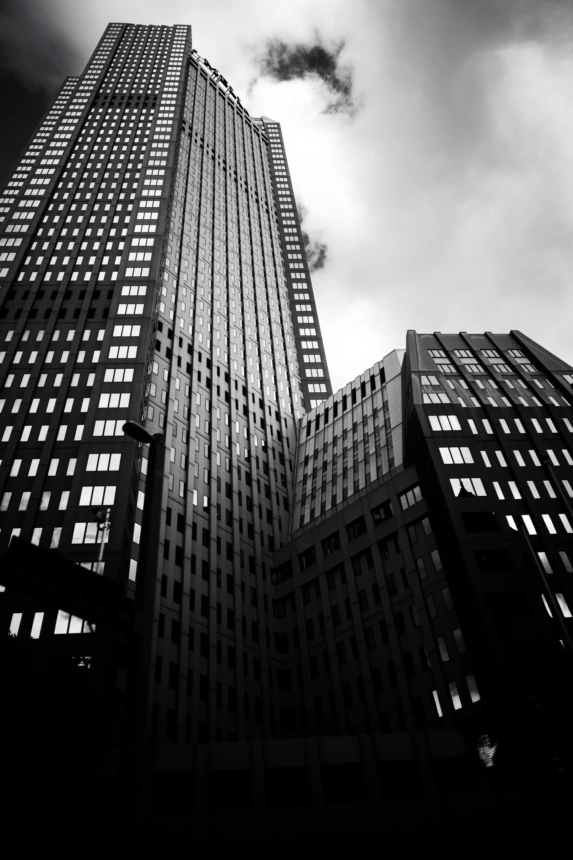 That is why these photos happened. No plan. No shot list. Just that pull to be present. The sky was low and the light was bouncing around in a way that made the windows glow. I decided to shoot everything in black and white because color felt like it would soften the edges. In monochrome, the buildings show their real personality. You see the grids of windows, the contrast where the shadows pool, the hard cuts where the structure interrupts the sky.